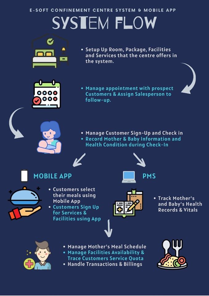 On the customers end, the confinement system is ready to be integrated with a customer mobile app to further complete the system accessibility and functionality. Specifically, the mobile app enables the mothers to check on the time slots available and place direct booking. In terms of meal schedule, the customers could check on the meal options available (ingredient and preparation details) and select their preferred menu using app. There are also features that facilitate customer engagement such as meal feedback and evaluation.