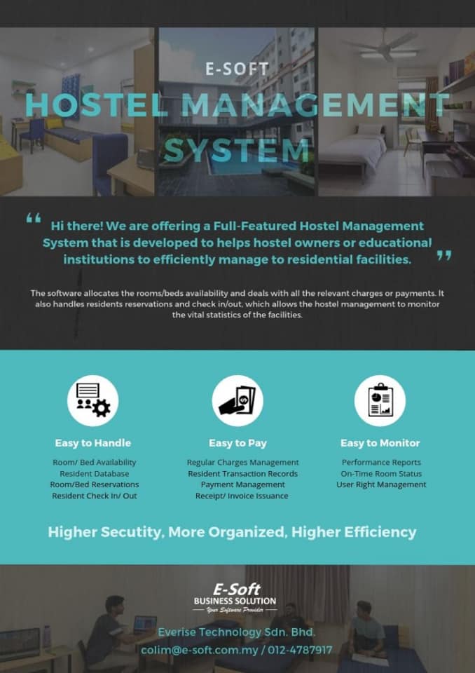 E-Soft Hostel Management System is a full-featured Property Management System designed specifically for the educational institution or private hostel owners to manage their residential facilities. It provides an innovative solution with a more systematic, organize and efficient means of managing a hostel. The system also offers a more transparent environment with a higher level of security, at the same time ensuring an easy access to all the vital information.
