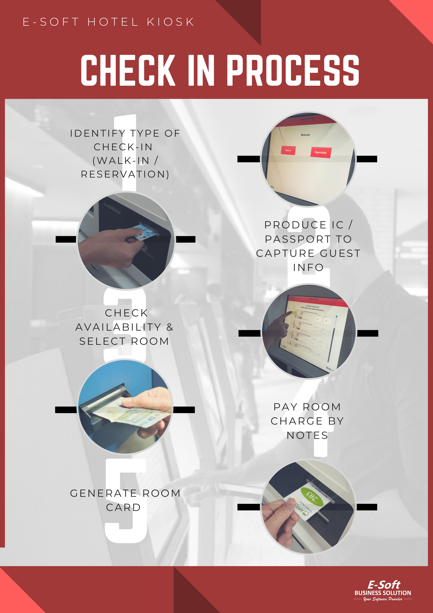 In recent trend, Hotels are working on in speeding up, simplifying and personalizing the check-in process. Hence, this is the point where a Fully Automated Frontdesk Solution, specifically Hotel Kiosk System comes into picture. E-Soft Hotel Kiosk provided a simple, easy & convenient way for guest to check in themselves to the hotel room, it has come with the features to check in the guest with reservation or walk in guest.