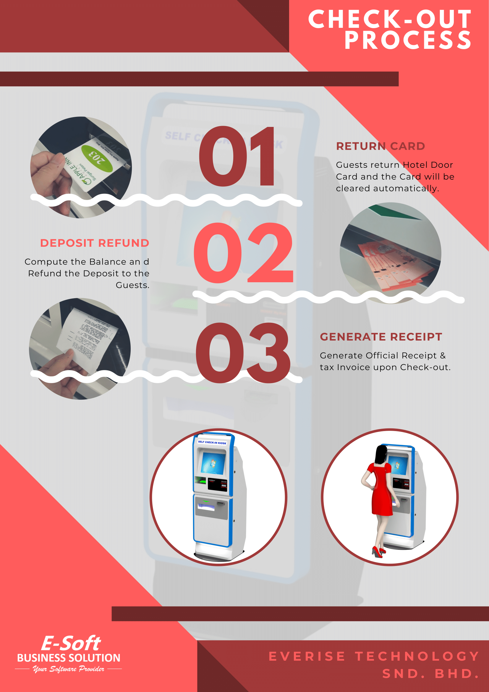 The hotel kiosk is able to handle guest payment in cash. Also, the process of deposit collection and refund can be automated.