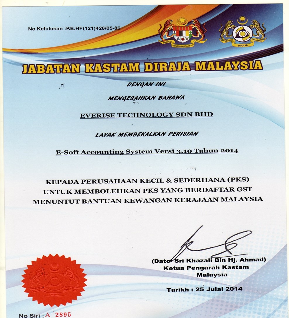 In 2014, our Accounting System was certified by JKDM as GST Software Vendor
