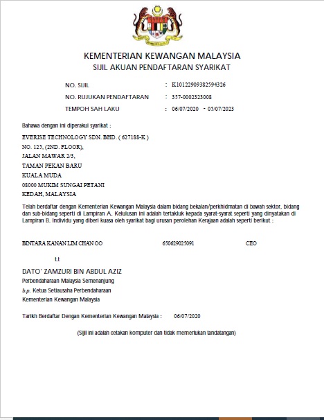 In 2020, we have approved as ICT & Software Supplier (Code: 210103) by MOF Malaysia