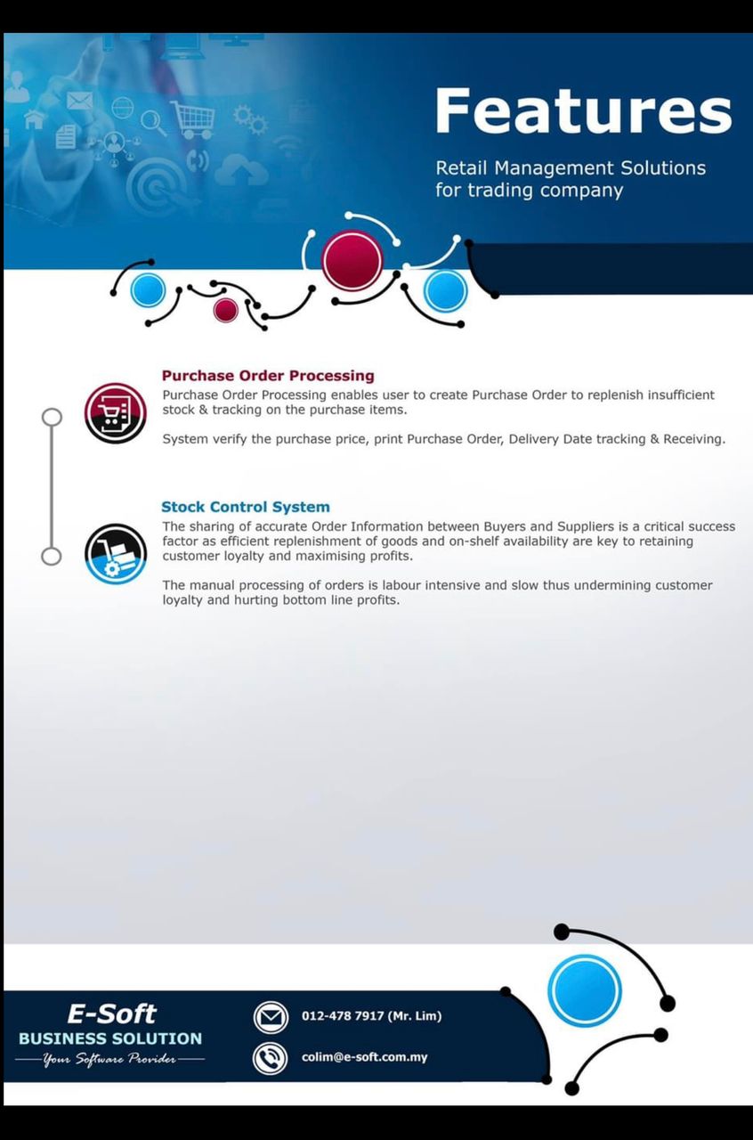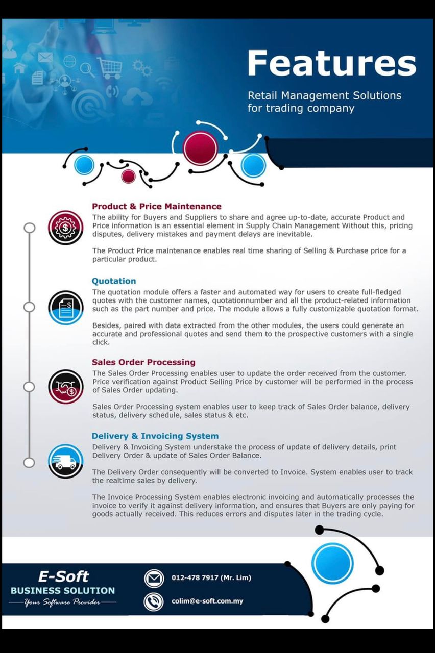 E-Soft Trading System offers an all-in-one software that provide retail management solutions for trading company. The system consists of Product & Price Maintenance, Quotation, Sales Order Processing, Delivery & Invoicing System, Purchase Order Processing and Stock Control System.